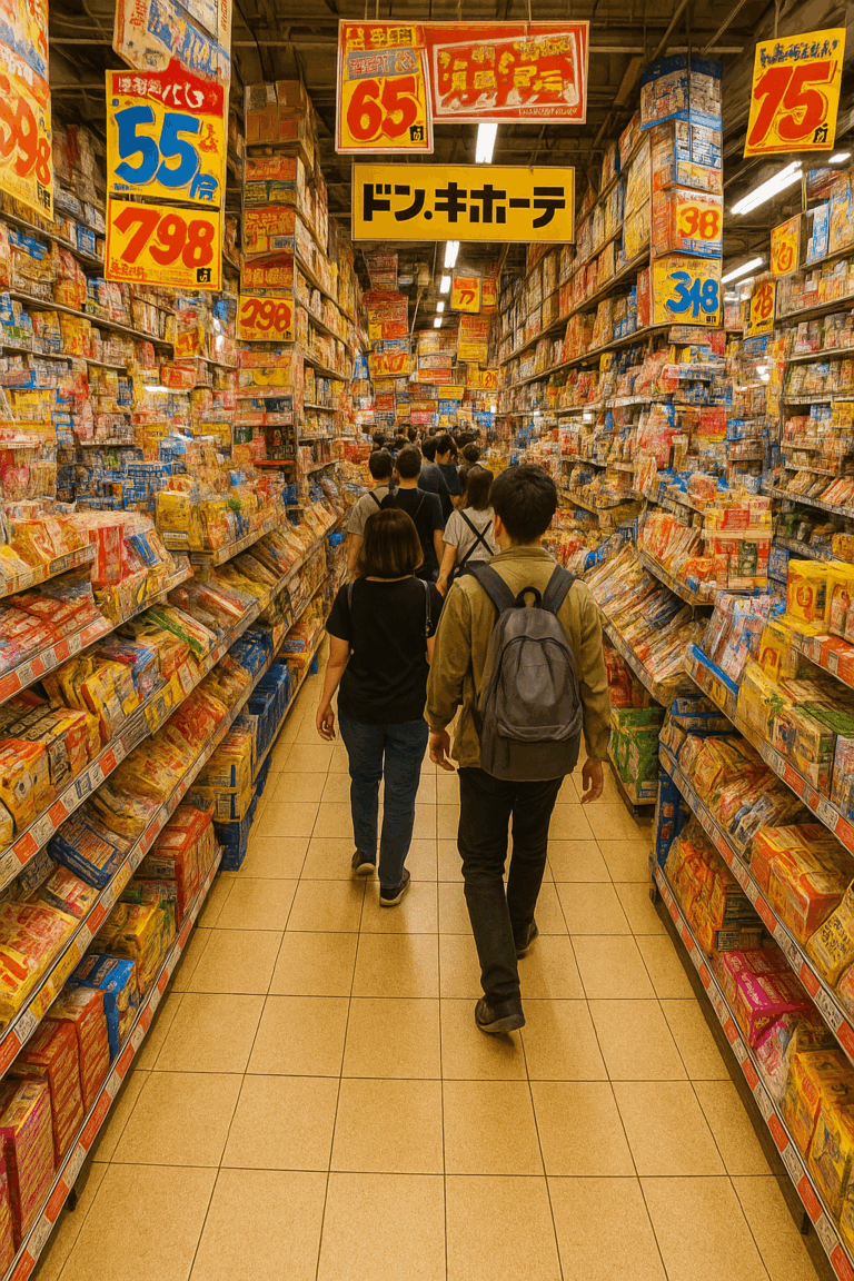 When you first walk into a Don Quijote (ドン・キホーテ), also known as Donki (ドンキ), it feels like stepping into a hell realm of pure nightmarish retail chaos. The aisles are so narrow you have to shuffle between them as crowds of people block the paths. Around you, merchandise is stacked in towers touching the ceiling. At the same time, handwritten signs scream prices and sales in neon colors. All the while, an incomprehensible mix of products, ranging from groceries and luxury goods to cosmetics, sex toys, electronics, and souvenirs, is crammed onto the shelves, barely intelligible and without any sense of where you actually are in the store.